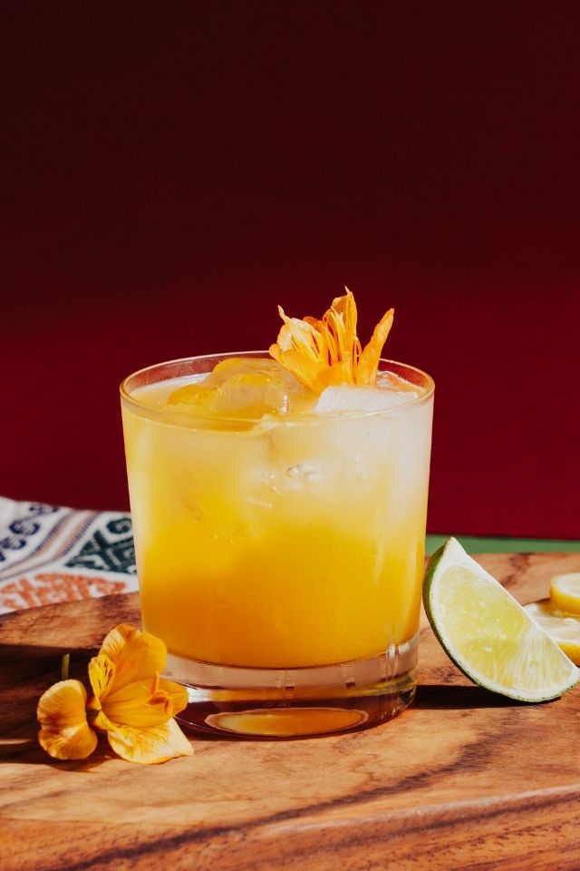 Inspirado en la frescura tropical, combina Tequila Dobel® Diamante con Frangelico®, concentrado de mango, jugo de limón verde y miel de agave. Una mezcla suave y equilibrada que abre la velada con un toque dorado y dulce.