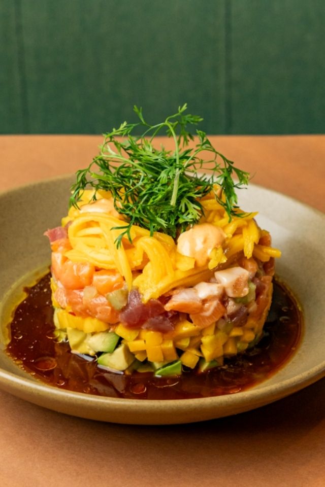 The blend of salmon and tuna, selected for their texture and purity, finds its ideal complement in mango. The fruit provides natural sweetness and a tropical aroma that enhances each layer of the dish, creating a contrast that awakens the palate.